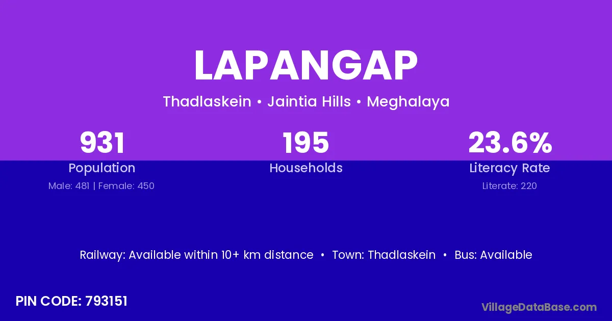 Thadlaskein is the nearest town to Lapangap village for major economic activities