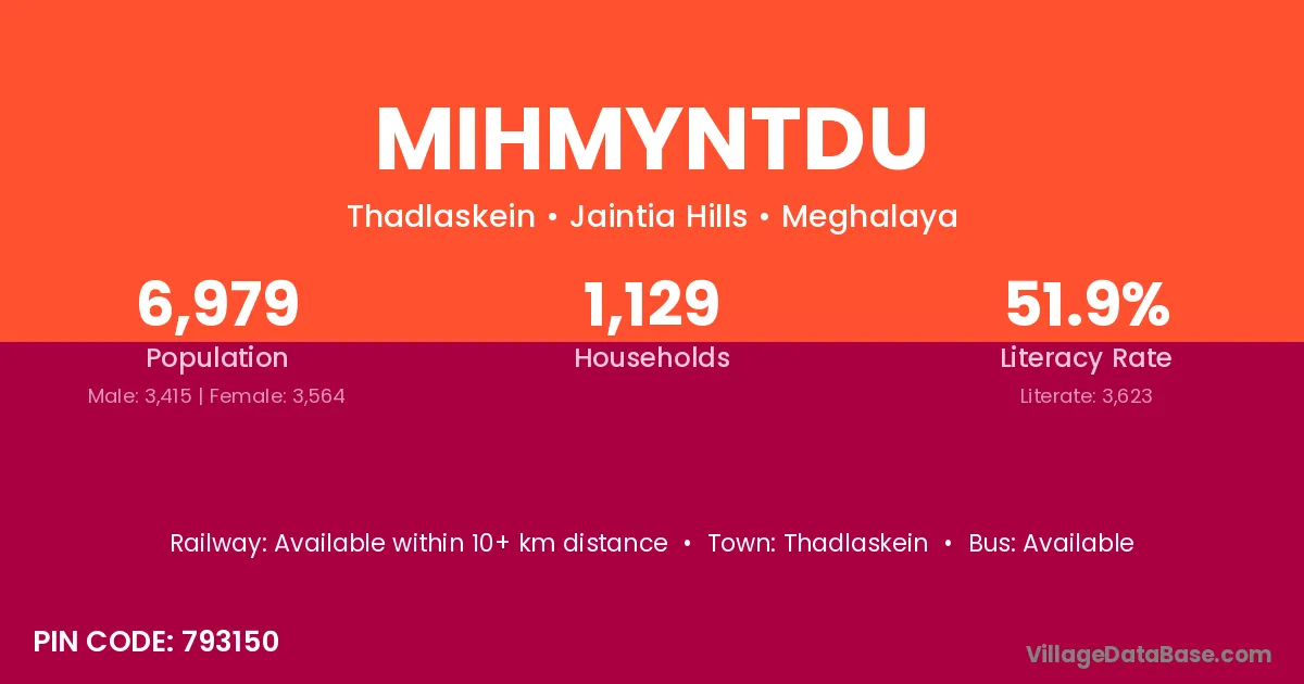 Mihmyntdu village has a total population of 6,979 people, of which 3,415 are males and 3,564 are females.