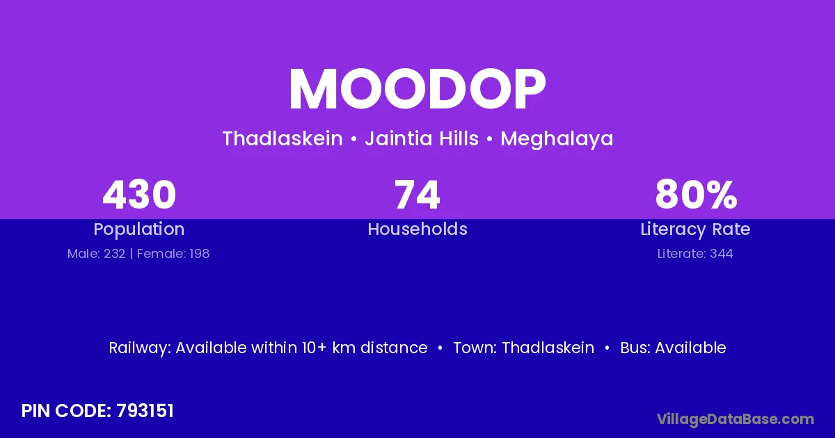 Thadlaskein is the nearest town to Moodop village for major economic activities