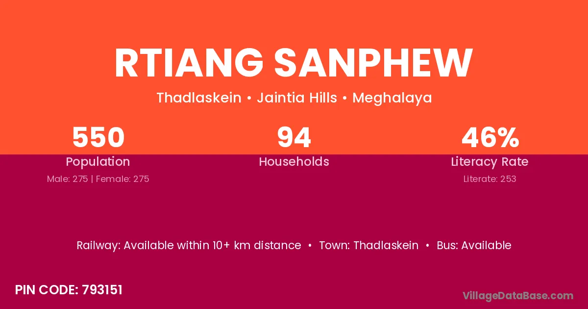 Rtiang Sanphew village has a total population of 550 people, of which 275 are males and 275 are females.