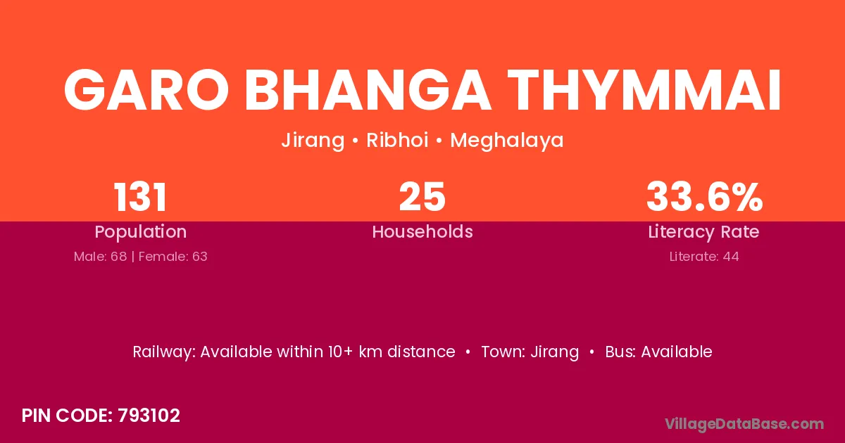 Garo Bhanga Thymmai village has a total population of 131 people, of which 68 are males and 63 are females.