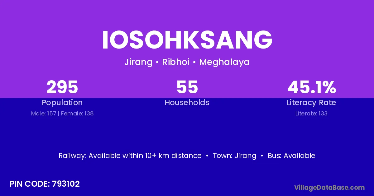 The literacy rate of Iosohksang village is 45.08%. Male literacy stands at 52.23% and female literacy at 36.96%.