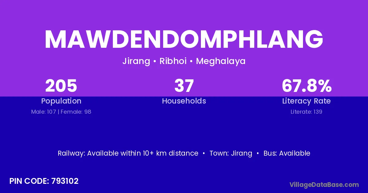 Mawdendomphlang village has a total population of 205 people, of which 107 are males and 98 are females.