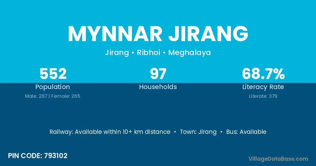 Mynnar Jirang village has a total population of 552 people, of which 287 are males and 265 are females.