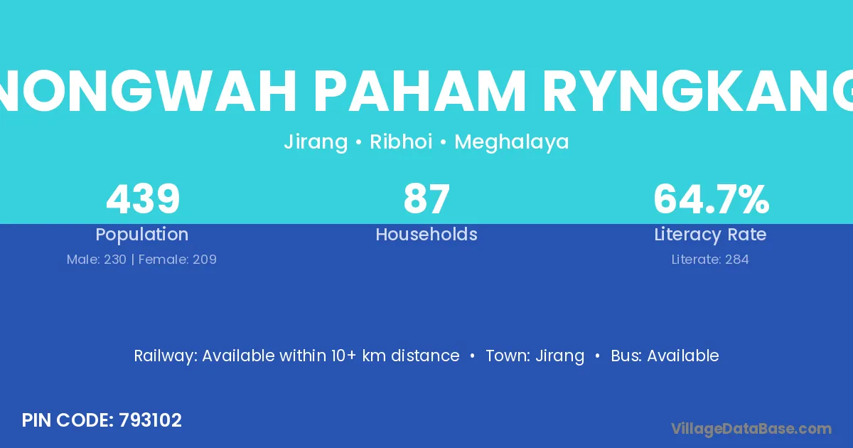 Nongwah Paham Ryngkang village has a total population of 439 people, of which 230 are males and 209 are females.