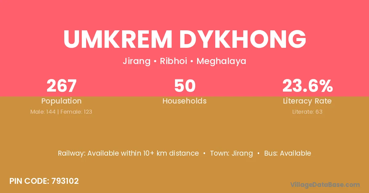 Umkrem Dykhong village has a total population of 267 people, of which 144 are males and 123 are females.