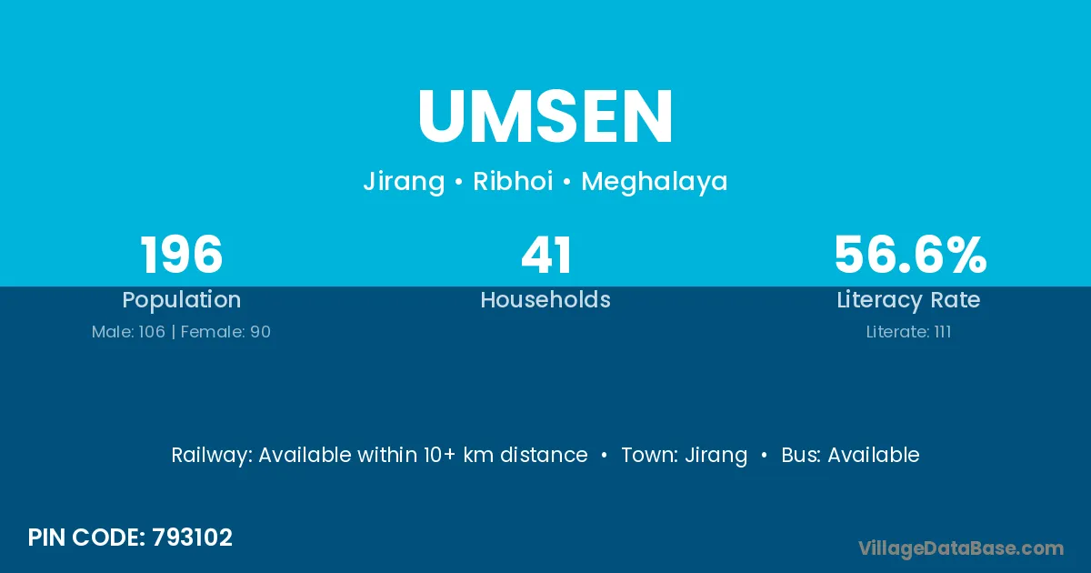 The literacy rate of Umsen village is 56.63%. Male literacy stands at 63.21% and female literacy at 48.89%.