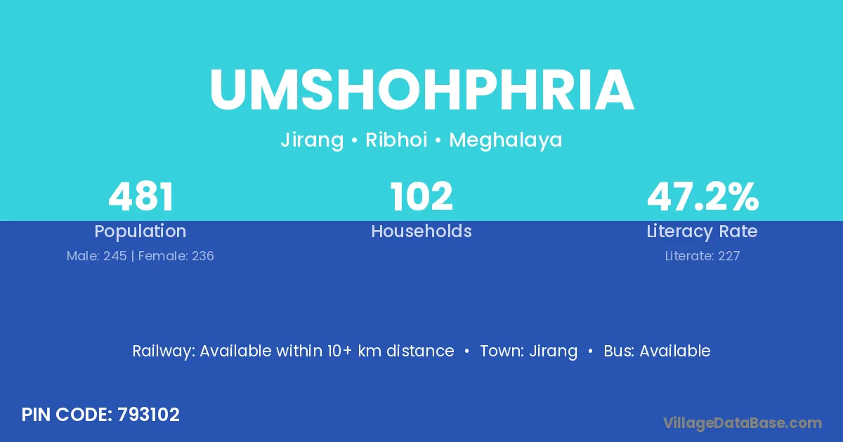 Umshohphria village has a total population of 481 people, of which 245 are males and 236 are females.