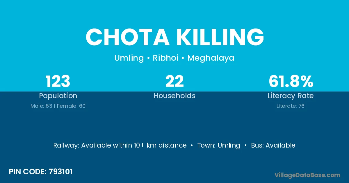 Chota Killing village has a total population of 123 people, of which 63 are males and 60 are females.