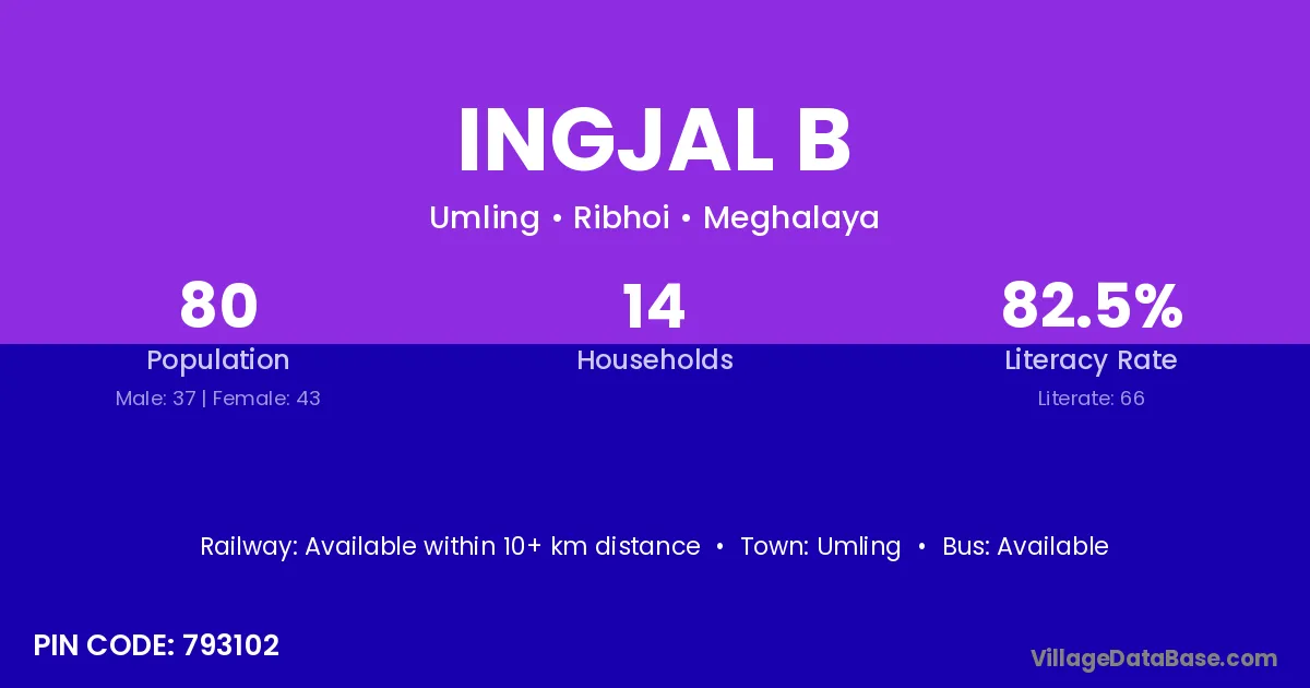 Ingjal B village has a total population of 80 people, of which 37 are males and 43 are females.