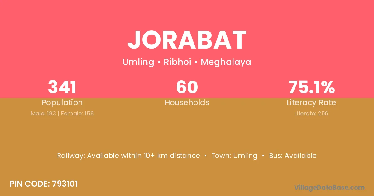 Jorabat village has a total population of 341 people, of which 183 are males and 158 are females.