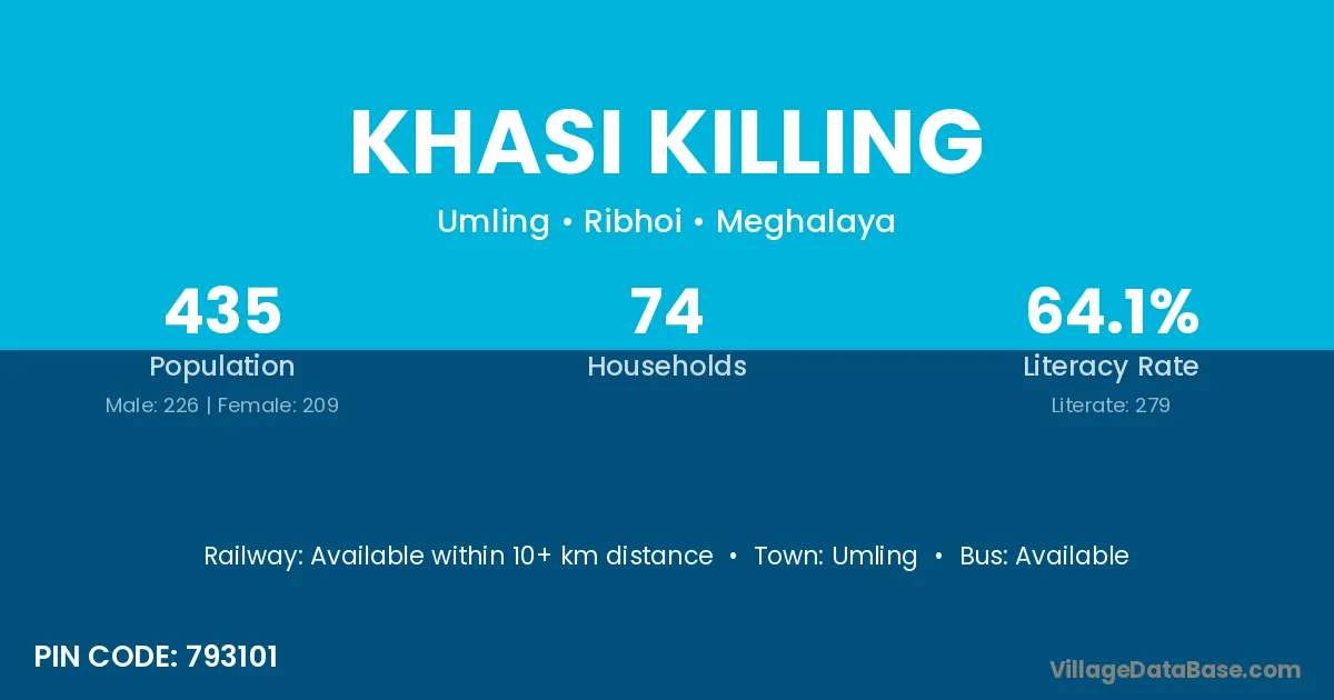 Khasi Killing village has a total population of 435 people, of which 226 are males and 209 are females.