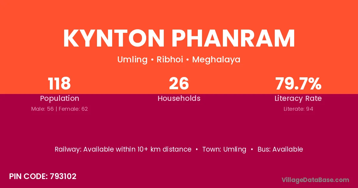 Kynton Phanram village has a total population of 118 people, of which 56 are males and 62 are females.
