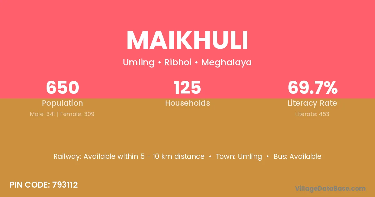 Maikhuli village has a total population of 650 people, of which 341 are males and 309 are females.