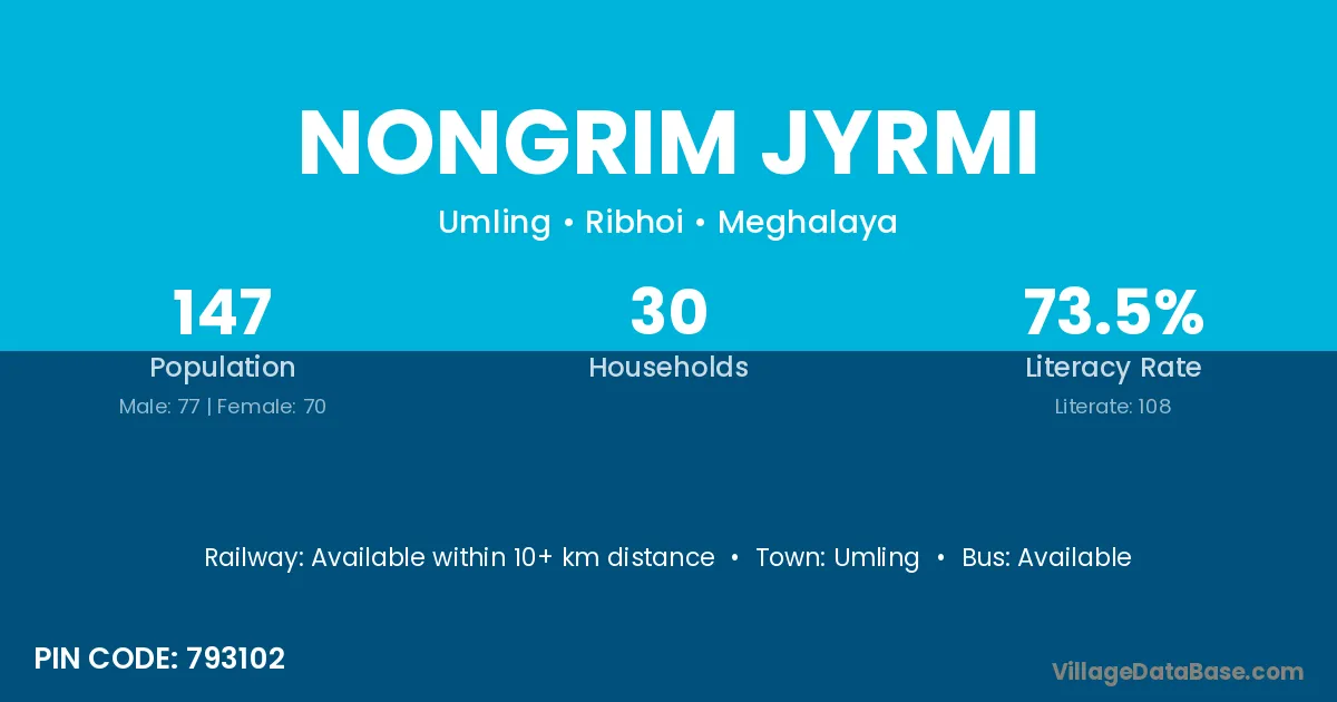 Nongrim Jyrmi village has a total population of 147 people, of which 77 are males and 70 are females.