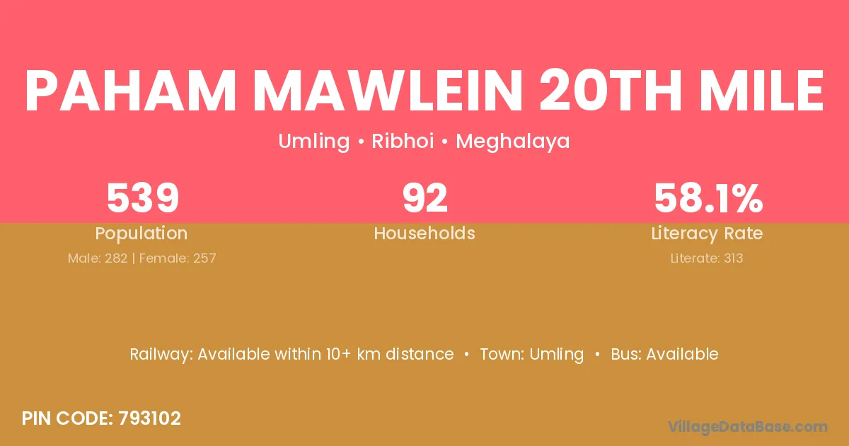 The literacy rate of Paham Mawlein 20th Mile village is 58.07%. Male literacy stands at 58.87% and female literacy at 57.20%.