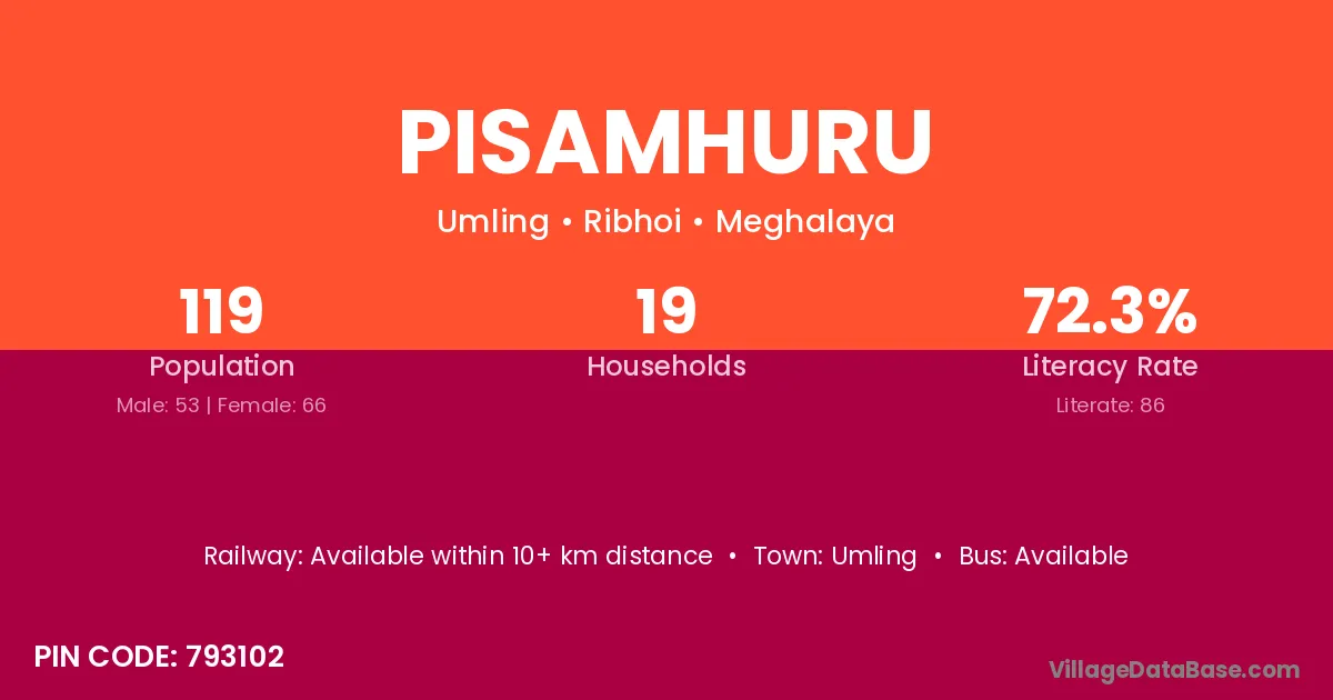 Pisamhuru village has a total population of 119 people, of which 53 are males and 66 are females.