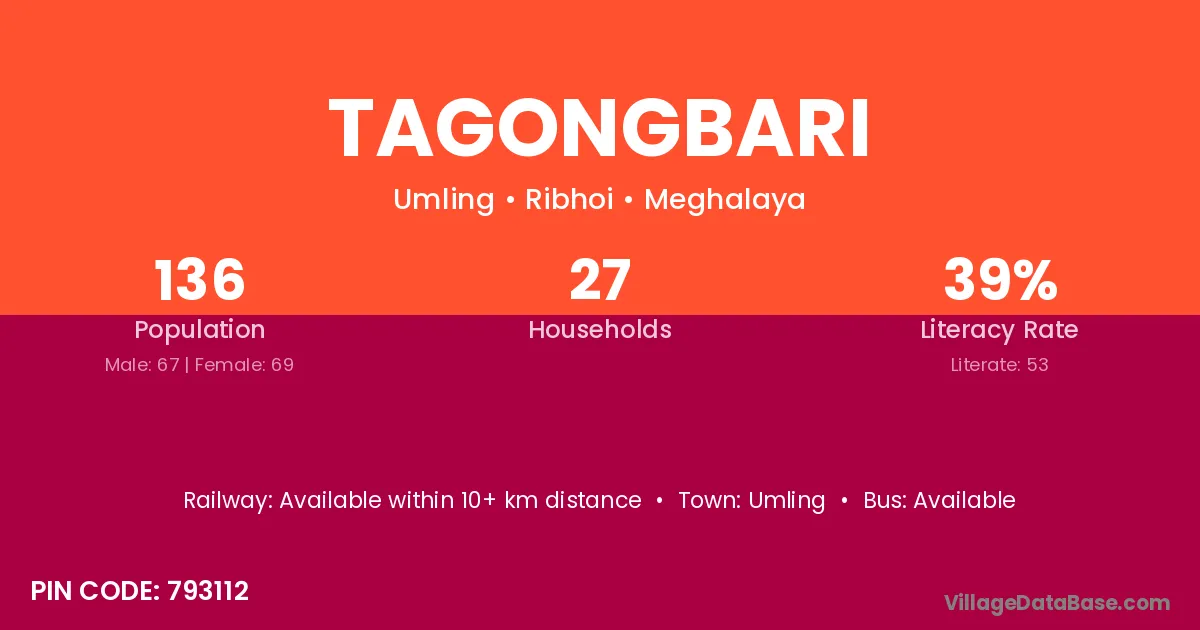 Tagongbari village has a total population of 136 people, of which 67 are males and 69 are females.
