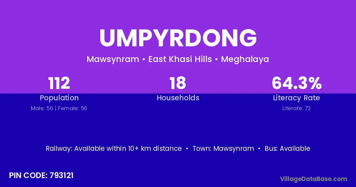 The literacy rate of Umpyrdong village is 70.76%. Male literacy stands at 71.97% and female literacy at 69.66%.