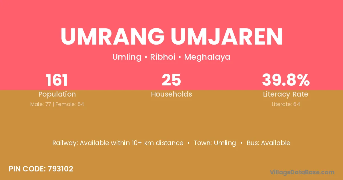 Umrang Umjaren village has a total population of 161 people, of which 77 are males and 84 are females.