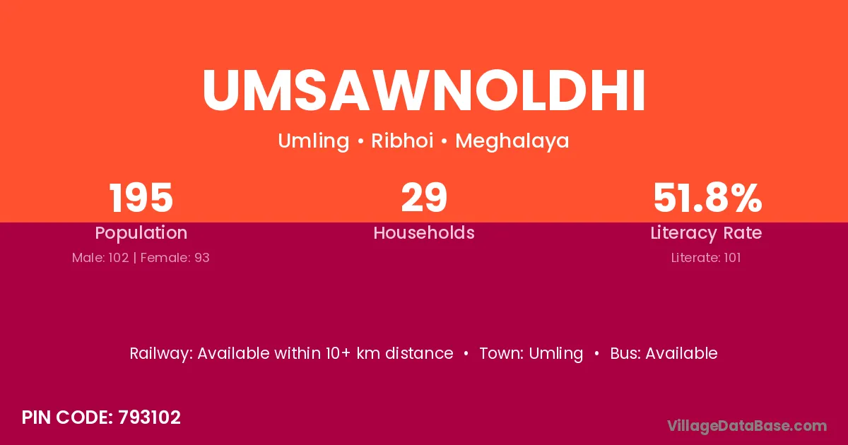Umsawnoldhi village has a total population of 195 people, of which 102 are males and 93 are females.