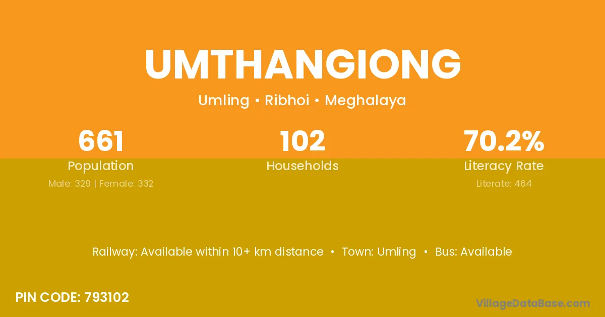 Umthangiong village has a total population of 661 people, of which 329 are males and 332 are females.
