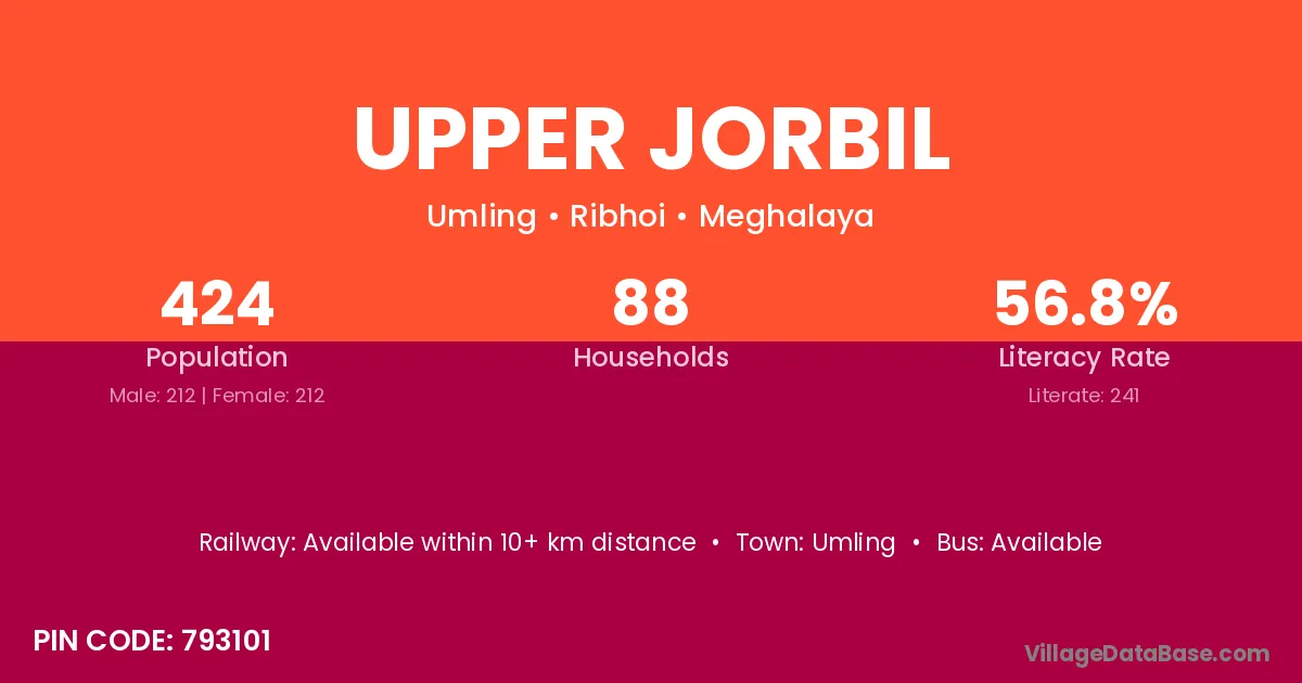 Upper Jorbil village has a total population of 424 people, of which 212 are males and 212 are females.