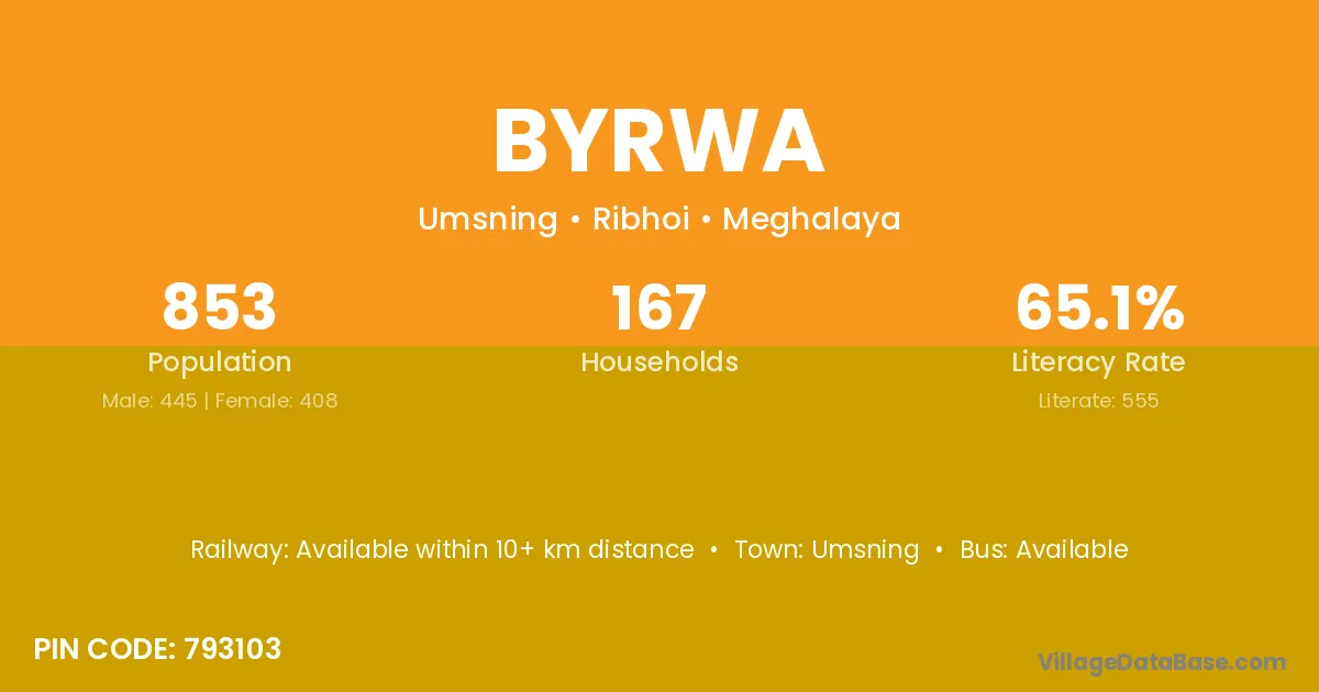 Byrwa village has a total population of 853 people, of which 445 are males and 408 are females.
