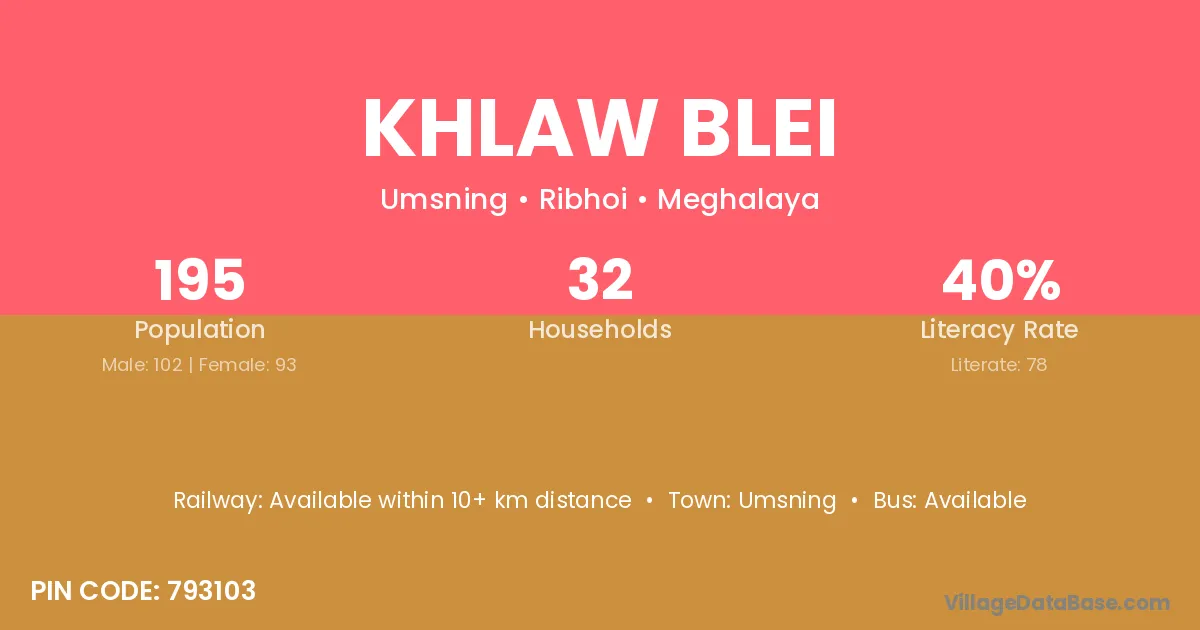 Khlaw Blei village has a total population of 195 people, of which 102 are males and 93 are females.