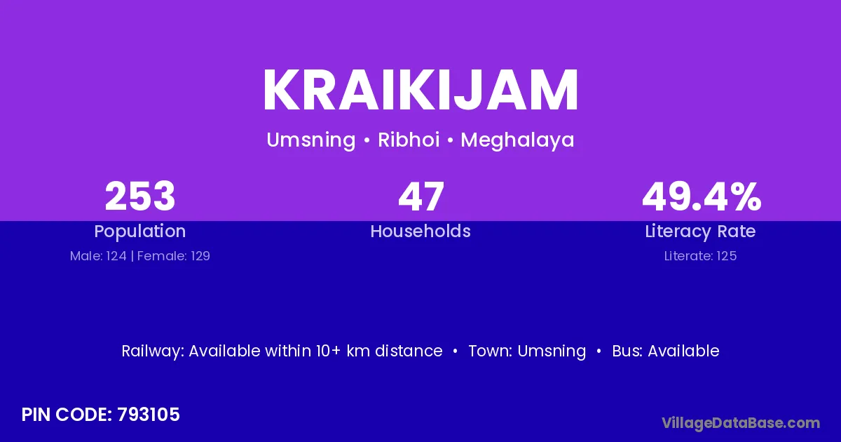 Kraikijam village has a total population of 253 people, of which 124 are males and 129 are females.