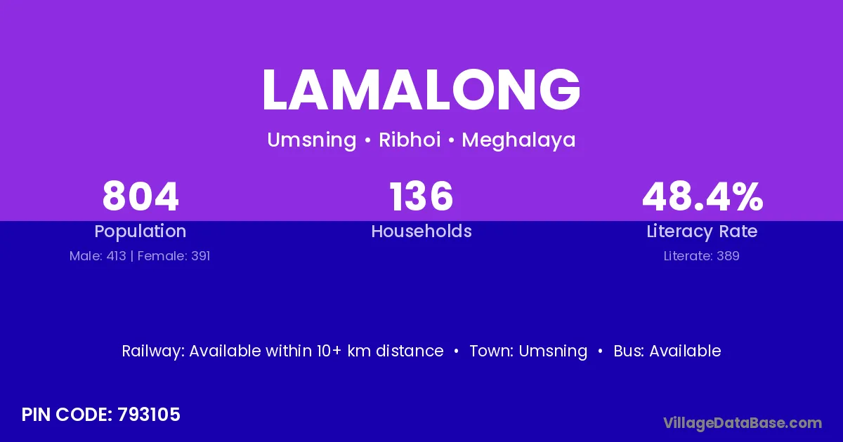 Lamalong village has a total population of 804 people, of which 413 are males and 391 are females.