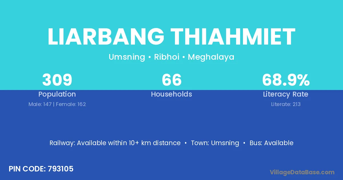 Liarbang Thiahmiet village has a total population of 309 people, of which 147 are males and 162 are females.