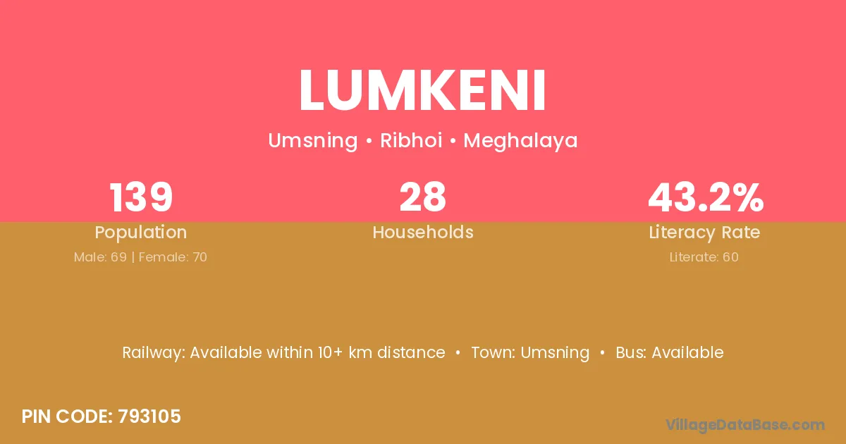 Lumkeni village has a total population of 139 people, of which 69 are males and 70 are females.