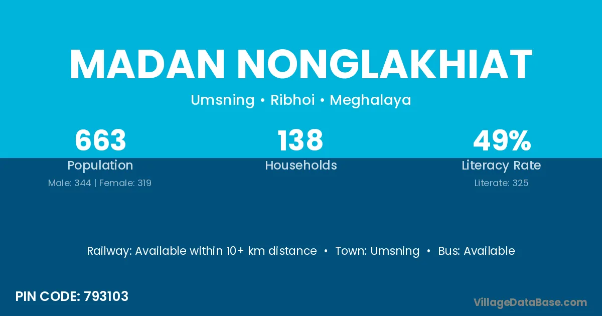 Madan Nonglakhiat village has a total population of 663 people, of which 344 are males and 319 are females.