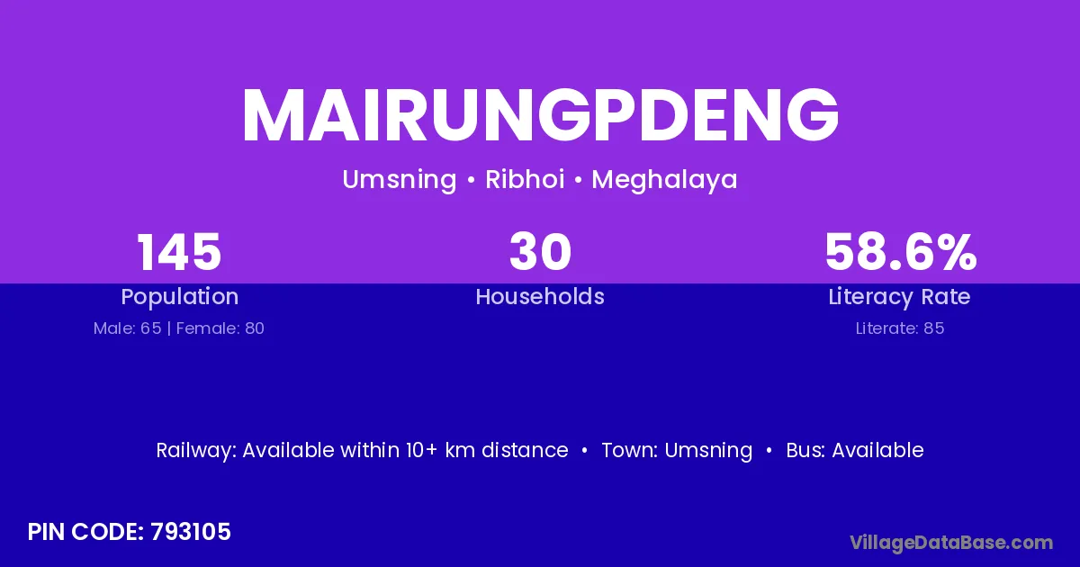 Mairungpdeng village has a total population of 145 people, of which 65 are males and 80 are females.