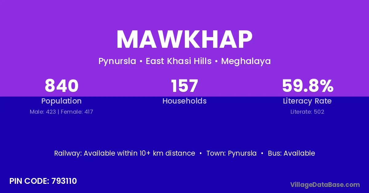 The literacy rate of Mawkhap village is 46.30%. Male literacy stands at 47.54% and female literacy at 44.68%.