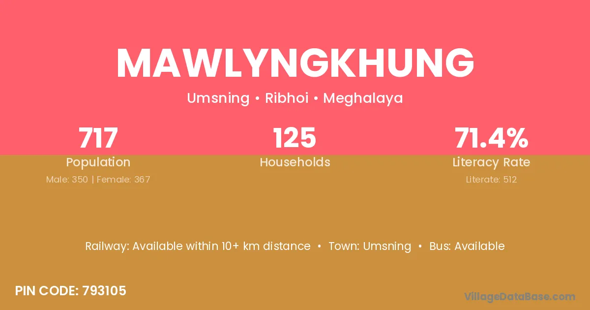 Mawlyngkhung village has a total population of 717 people, of which 350 are males and 367 are females.