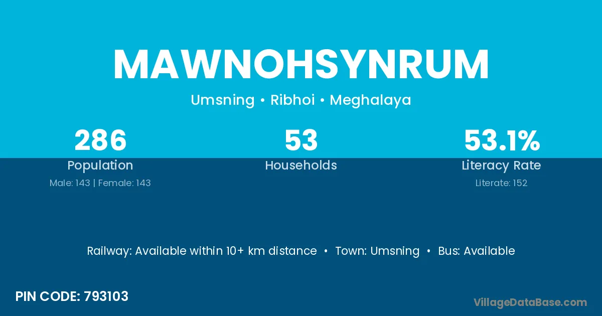 Mawnohsynrum village has a total population of 286 people, of which 143 are males and 143 are females.
