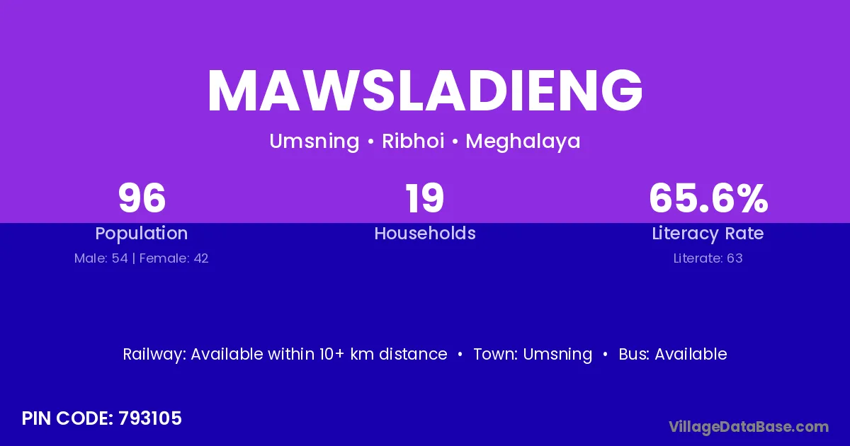 Mawsladieng village has a total population of 96 people, of which 54 are males and 42 are females.