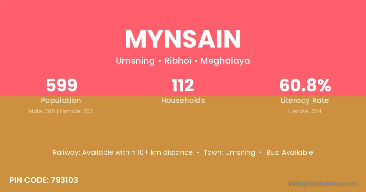 Mynsain village has a total population of 599 people, of which 306 are males and 293 are females.