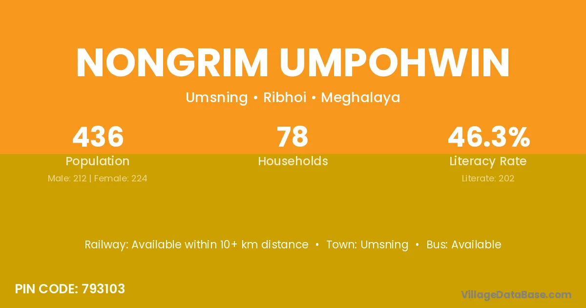 Nongrim Umpohwin village has a total population of 436 people, of which 212 are males and 224 are females.