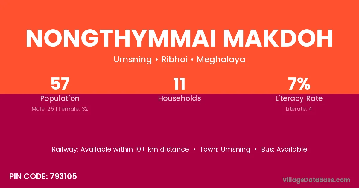 Nongthymmai Makdoh village has a total population of 57 people, of which 25 are males and 32 are females.