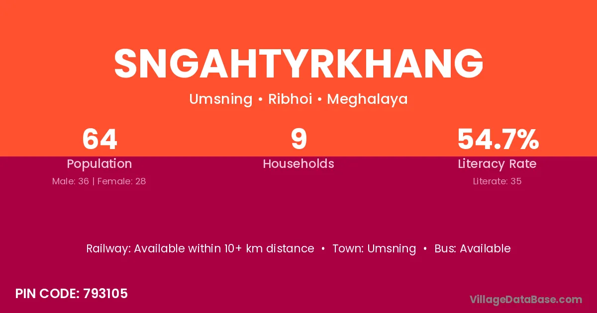 Sngahtyrkhang village has a total population of 64 people, of which 36 are males and 28 are females.