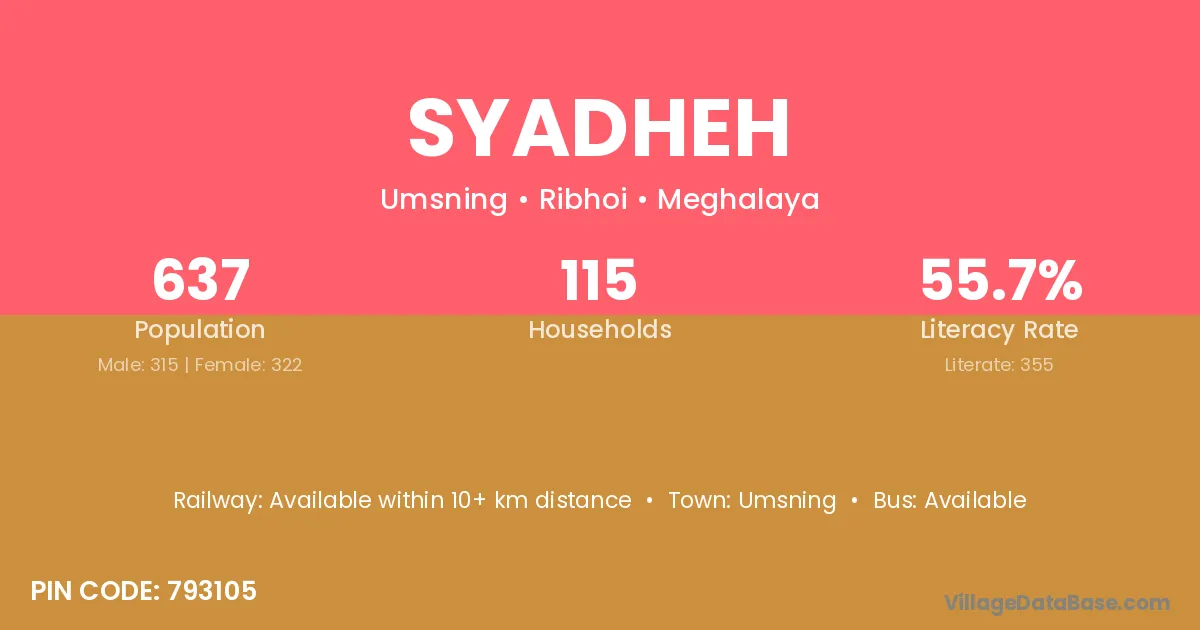 Syadheh village has a total population of 637 people, of which 315 are males and 322 are females.