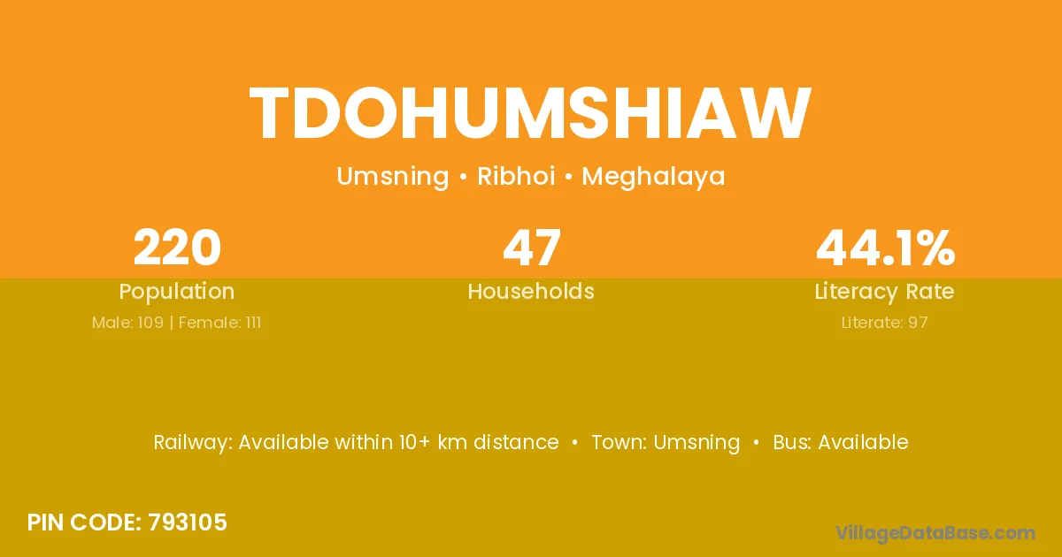 Tdohumshiaw village has a total population of 220 people, of which 109 are males and 111 are females.