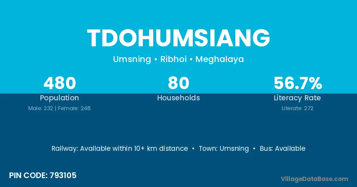 Tdohumsiang village has a total population of 480 people, of which 232 are males and 248 are females.