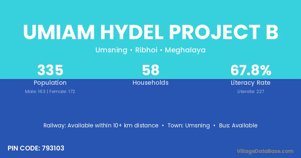 Umiam Hydel Project B village has a total population of 335 people, of which 163 are males and 172 are females.