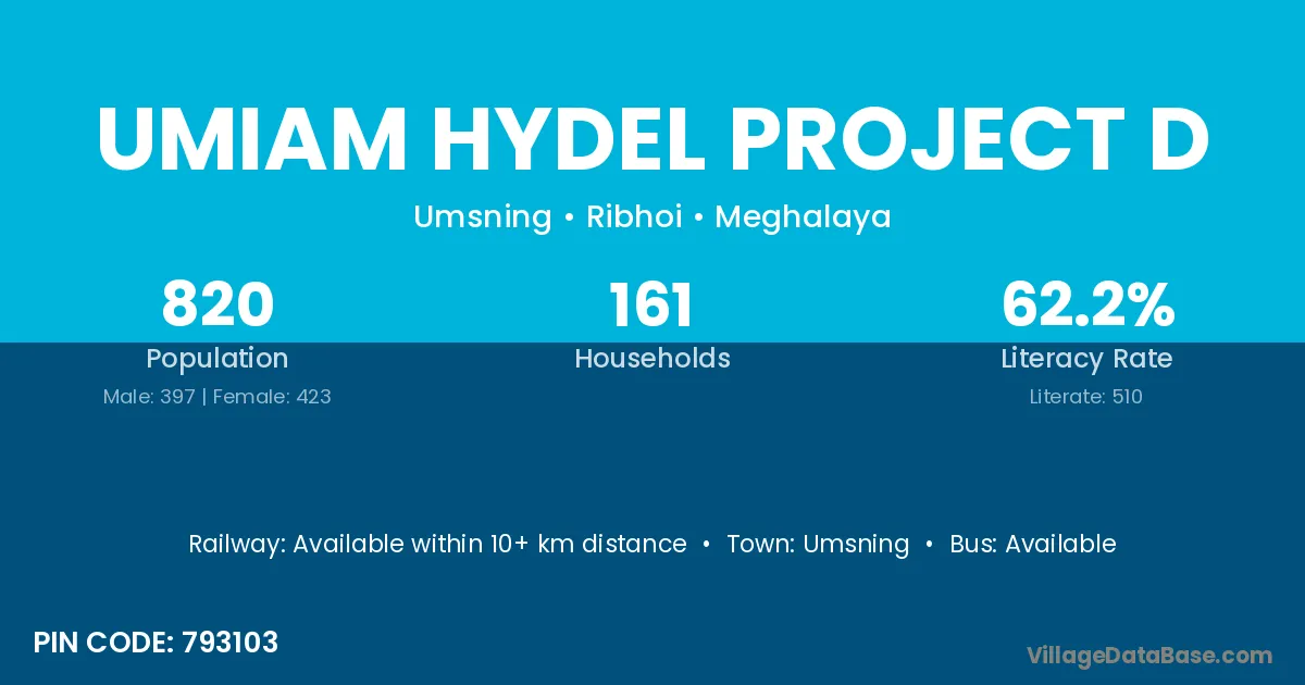 Umiam Hydel Project D village has a total population of 820 people, of which 397 are males and 423 are females.