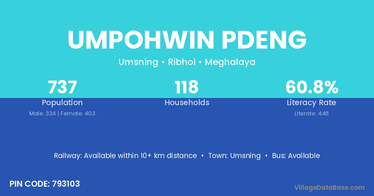 Umpohwin Pdeng village has a total population of 737 people, of which 334 are males and 403 are females.