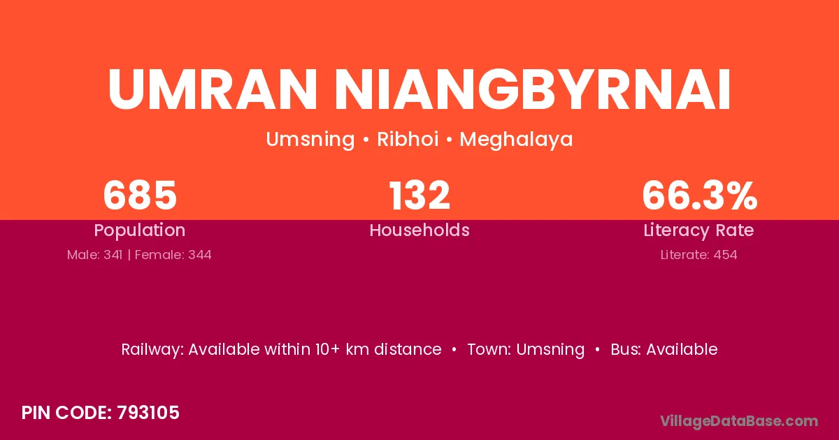 Umran Niangbyrnai village has a total population of 685 people, of which 341 are males and 344 are females.